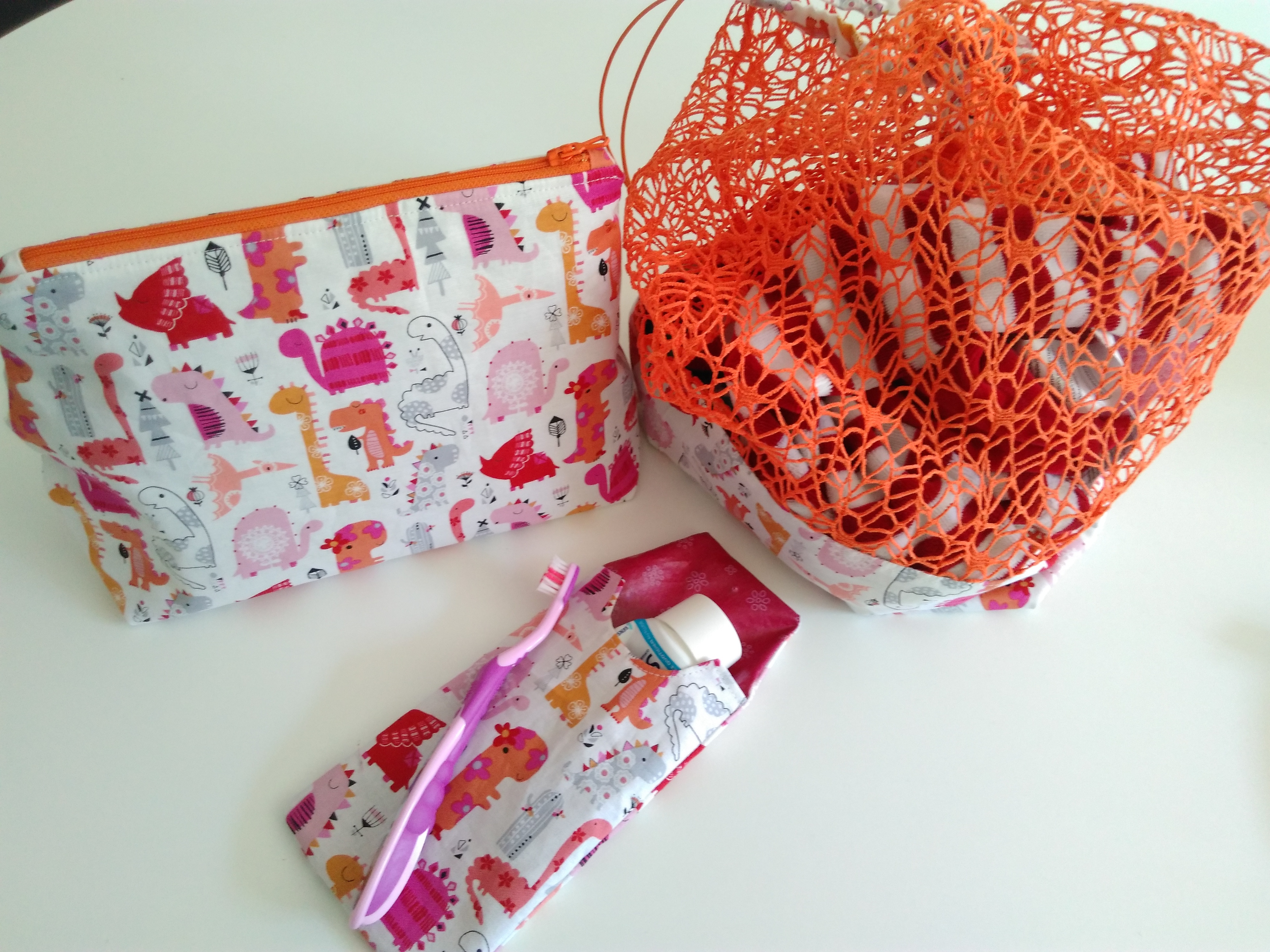 J’ai eu l’idée de préparer cet ensemble trousse de toilette, étuis à brosse à dent et dentifrice, et sac à linge!