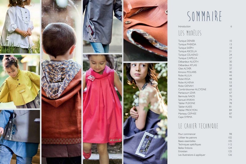 23 créations sont proposées offrant une coupe ou des détails recherchés et originaux qui feront la différence. Tuniques, tops, jupes, robes, pantalons, salopettes, tabliers, sarouel, manteau… tout y est pour constituer un dressing complet digne d’un vrai créateur, pour fillettes ou petits garçons (pour lesquels il est souvent difficile de trouver des idées créatives).